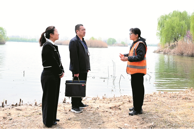 图为3月24日,河南省洛阳市孟津区纪检监察干部在孟津黄河湿地国家级自然保护区向工作人员了解有关情况。王奇 摄大地回春,天气回暖,位于河南省洛阳市的孟津黄河湿地国家级自然保护区内,一群群绿翅鸭、针尾鸭、鸬鹚等鸟类,正在悠闲地觅食、嬉戏,栖息于这片水草丰茂的湿地之中。经孟津黄河湿地国家级自然保护区流入黄河的...