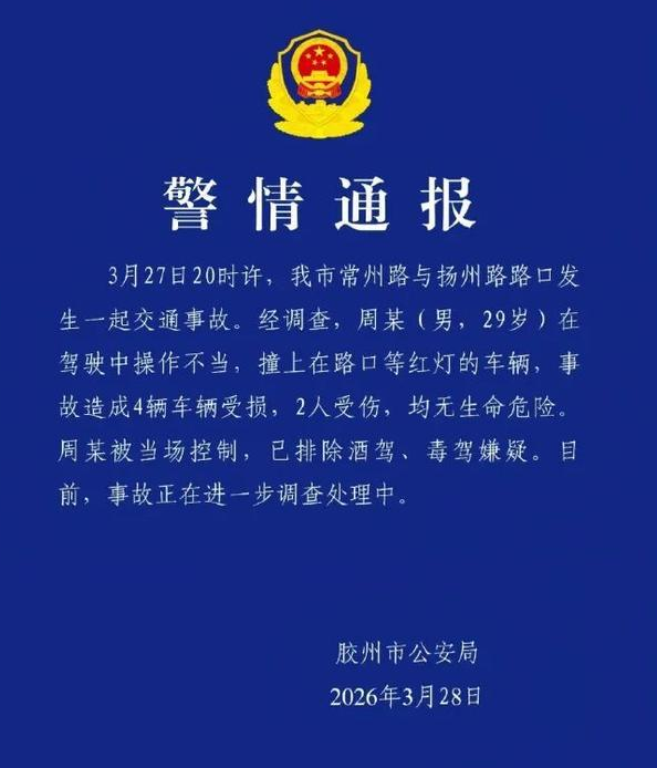 据“胶州公安”3月28日发布的“警情通报”:3月27日20时许,我市常州路与扬州路路口发生一起交通事故。经调查,周某(男,29岁)在驾驶中操作不当,撞上在路口等红灯的车辆,事故造成4辆车辆受损,2人受伤,均无生命危险。周某被当场控制,已排除酒驾、毒驾嫌疑。目前,事故正在进一步调查处理中。网传视频截图来 源:胶州公安...