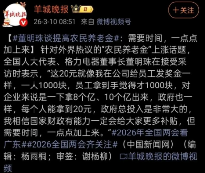 口出狂言2026年全国两会,格力董事长董明珠又因一句话冲上热搜。面对农民基础养老金每月涨20元的话题,她竟这样类比:“就像公司给员工发1000元奖金,员工嫌少,但企业要掏8到10个亿;政府也一样,每人给20元,总投入其实很大,这需要时间,一点点加。”这话一出,全网瞬间炸锅。有人痛批:“把政府当公司管,缺的不只是常识...